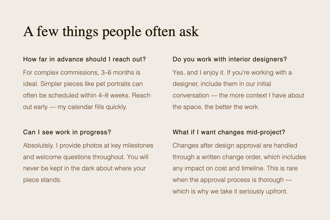 Every piece I make begins with a conversation and ends with something that couldn't have been made any other way. Here's what you can expect from the moment you reach out to the moment your work is delivered.